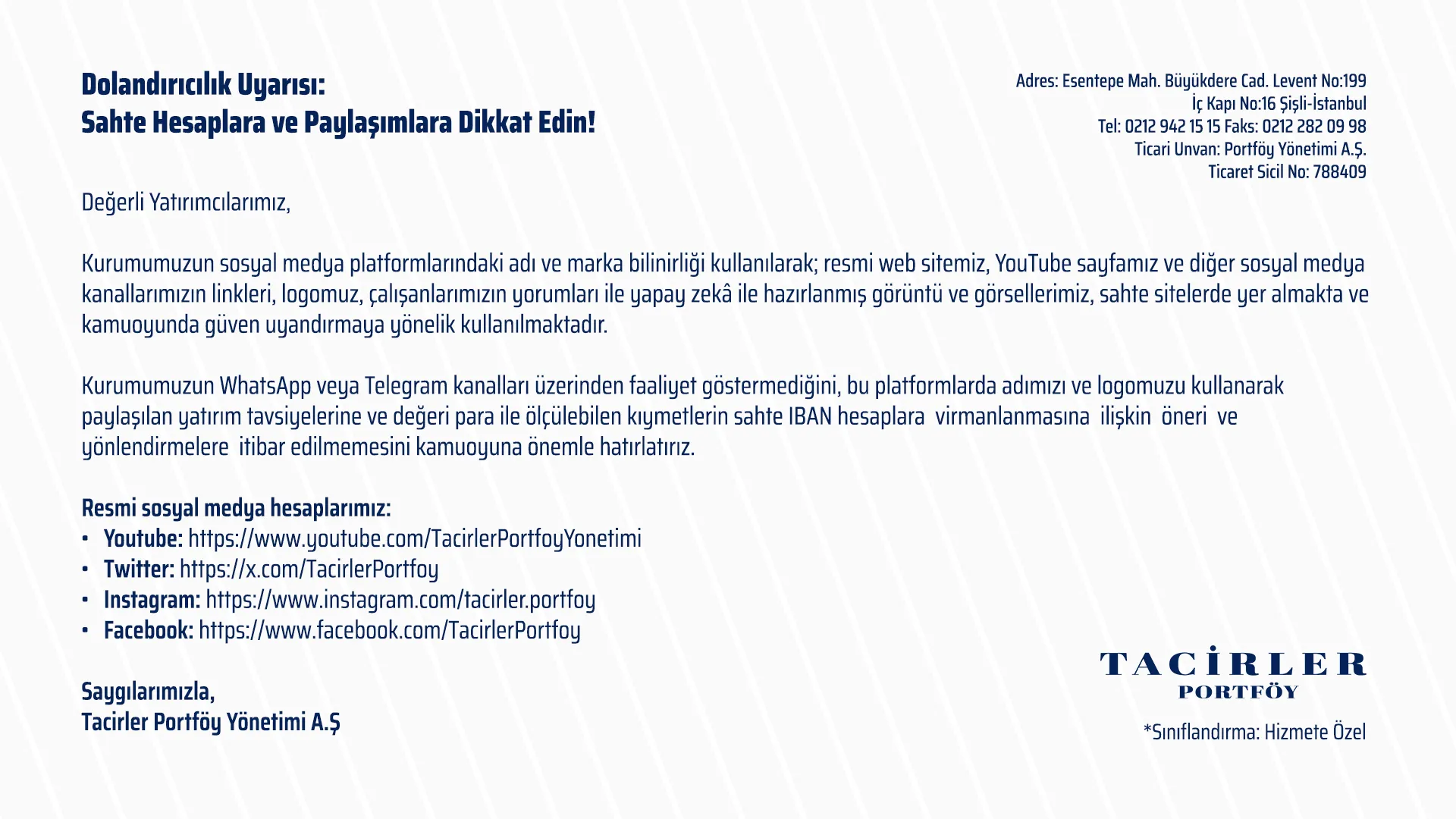 Kurumumuzun sosyal medya platformlarındaki adı ve marka bilinirliği kullanılarak; resmi web sitemiz, YouTube sayfamız ve diğer sosyal medya kanallarımızın linkleri, logomuz, çalışanlarımızın yorumları ile yapay zekâ ile hazırlanmış görüntü ve görsellerimiz, sahte sitelerde yer almakta ve kamuoyunda güven uyandırmaya yönelik kullanılmaktadır. Detaylı Bilgi
